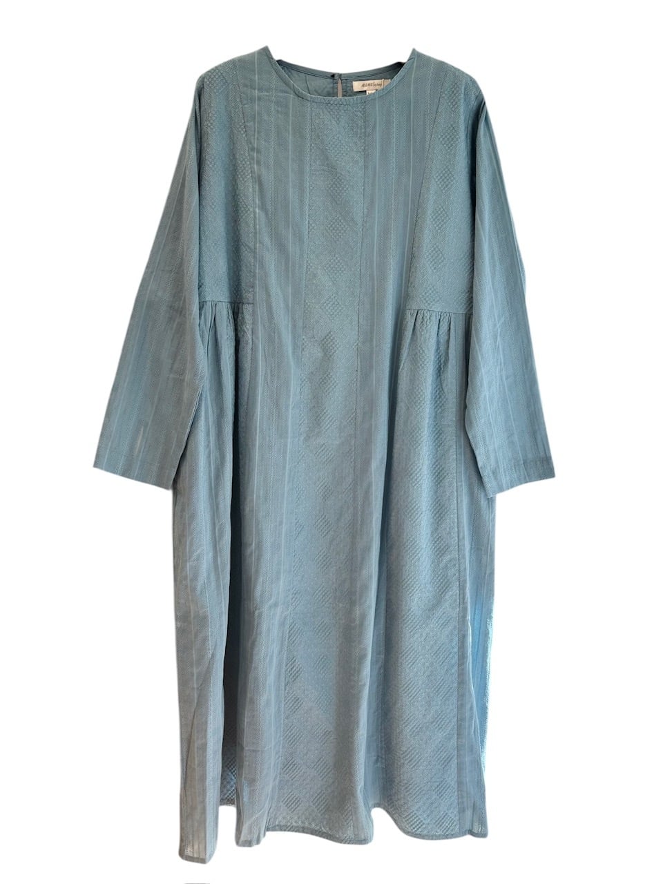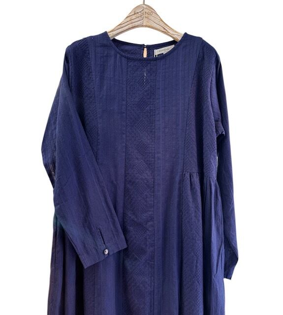 幾何柄とボーダー柄のインド綿レースを贅沢に使用した、スタイリッシュなワンピースです。縦の切り替えデザインがスッキリとしたシルエットを実現し、サイドの切り替えギャザーが女性らしいラインを際立たせます。