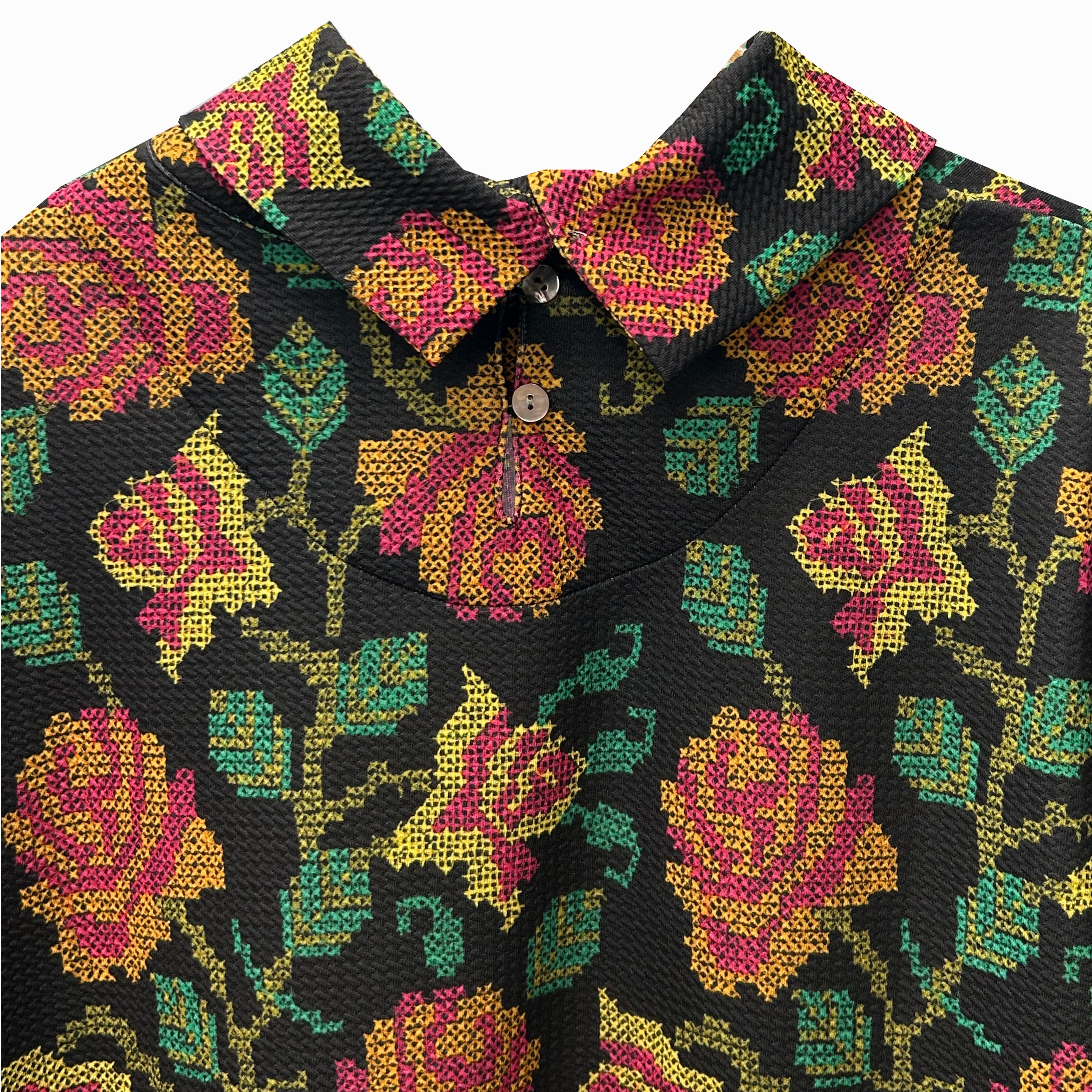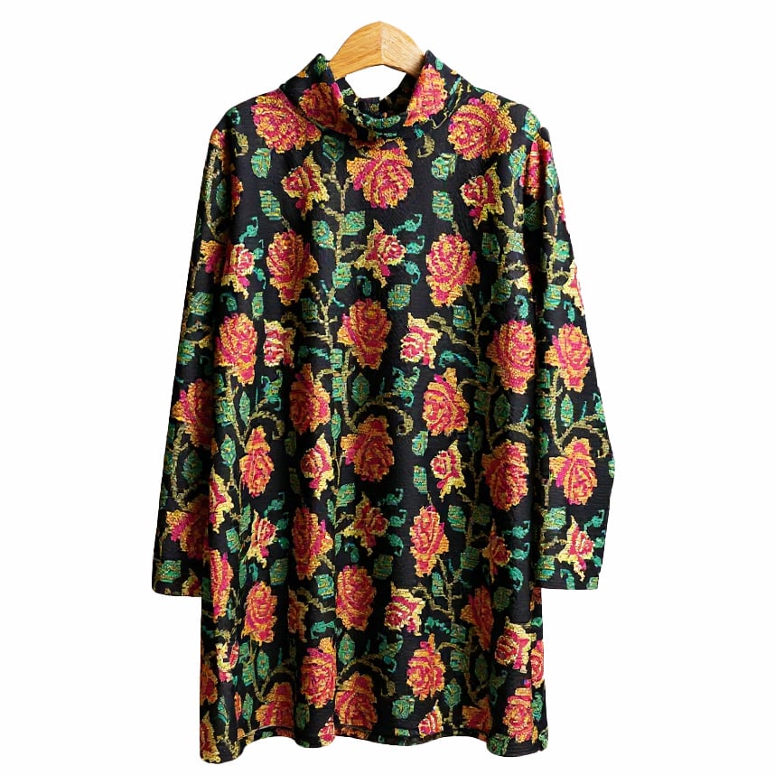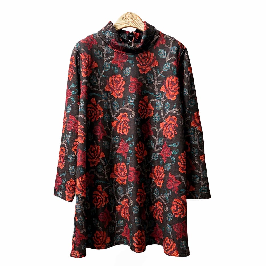 華やかなローズ柄が目を引く、クロスステッチ刺繡をプリントしたカットソーチュニックです。