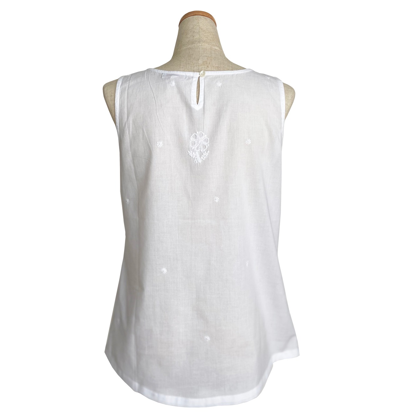 刺繍ノースリーブブラウスです。胸元に豪華な手刺繍を施し、ジャケットやカーディガンしてのインナーとしてもお使いいただけます。後ろ見頃のかわいい花刺繍もポイントです。