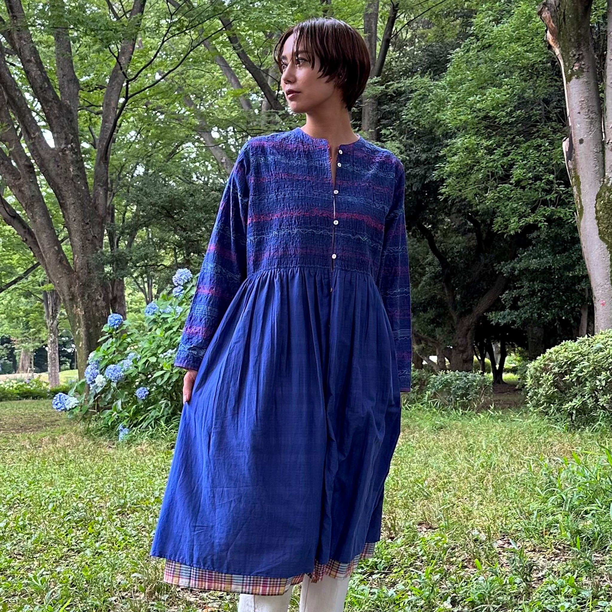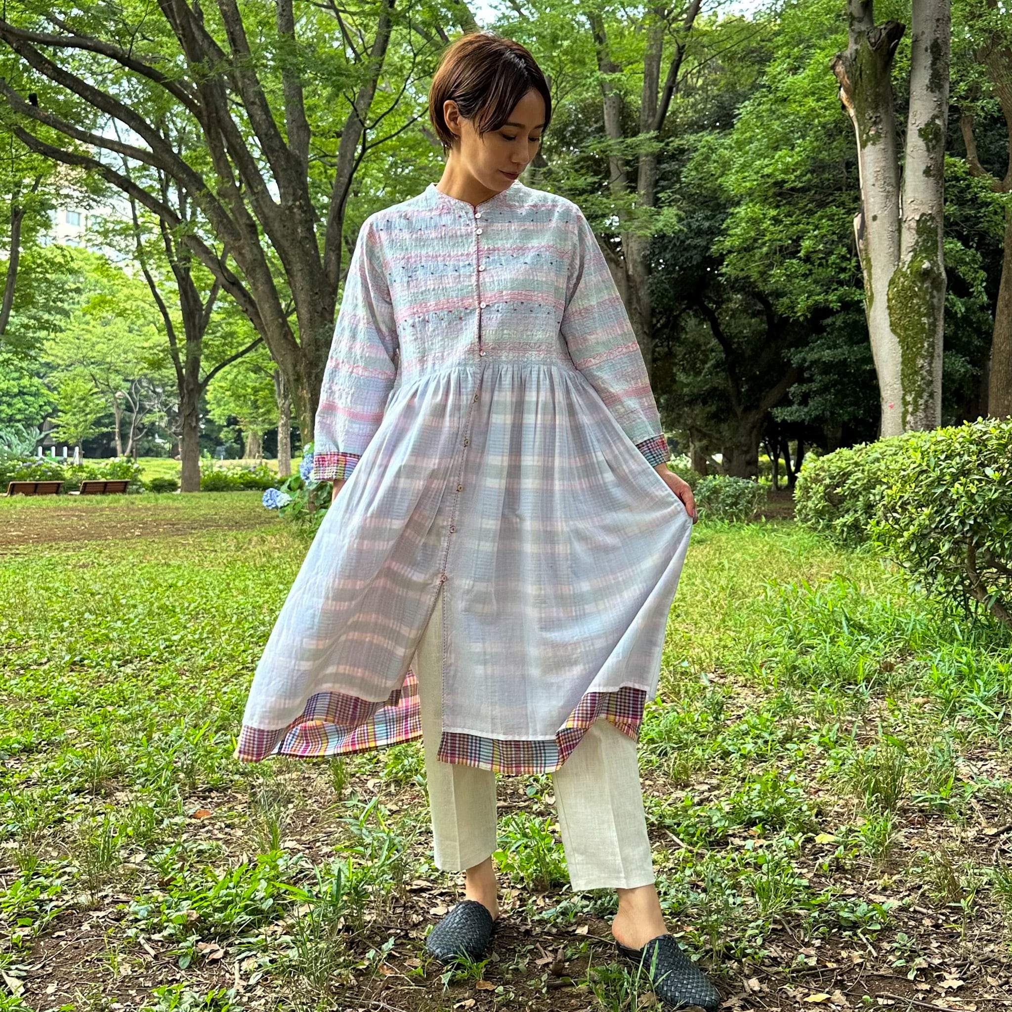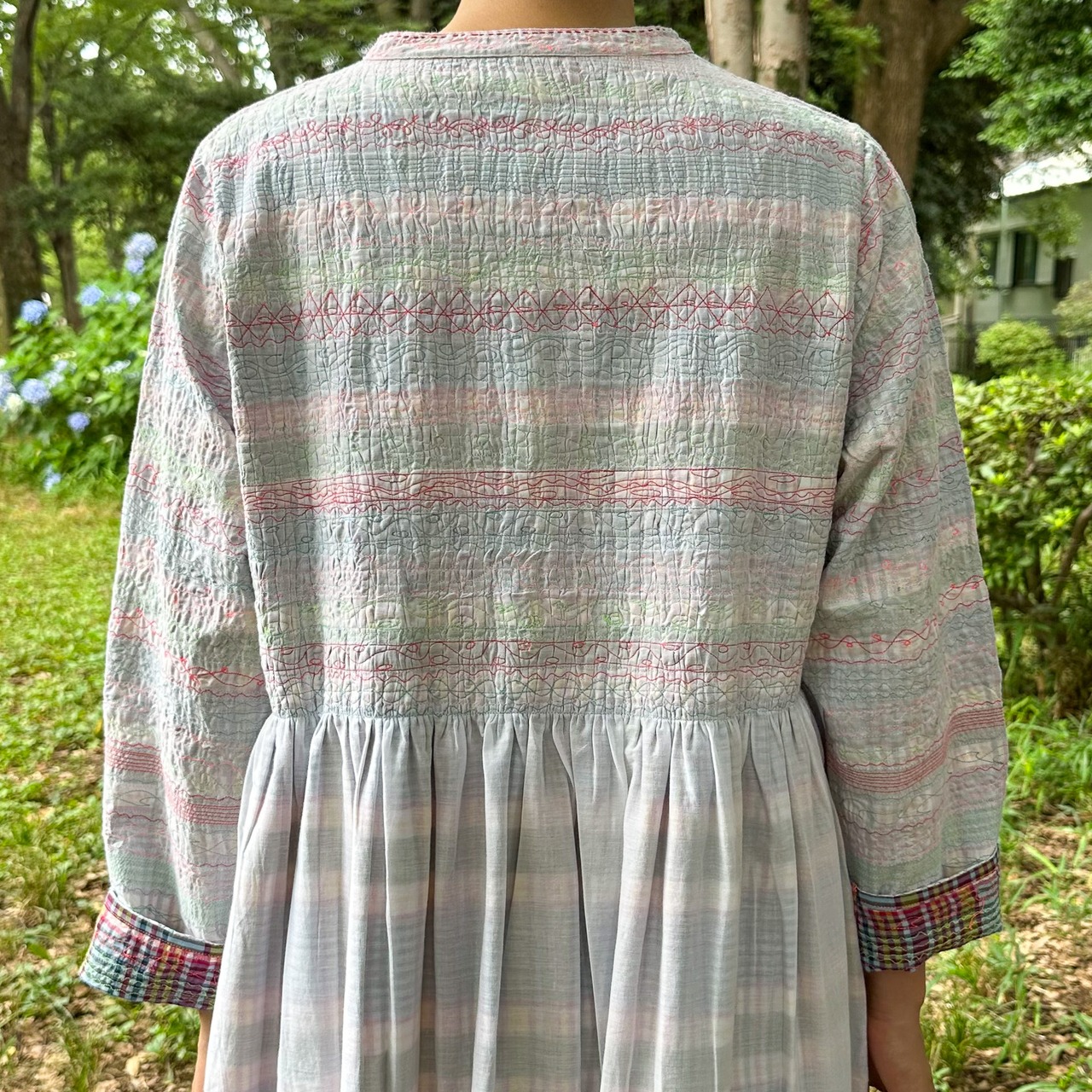 上半身にはシャーリング刺繍をほどこし、下半身はふわっとした仕上がりの遊び心のあるデザインで、気楽に羽織って表裏で着られます。毎日のお出かけが楽しくなるような一枚です。