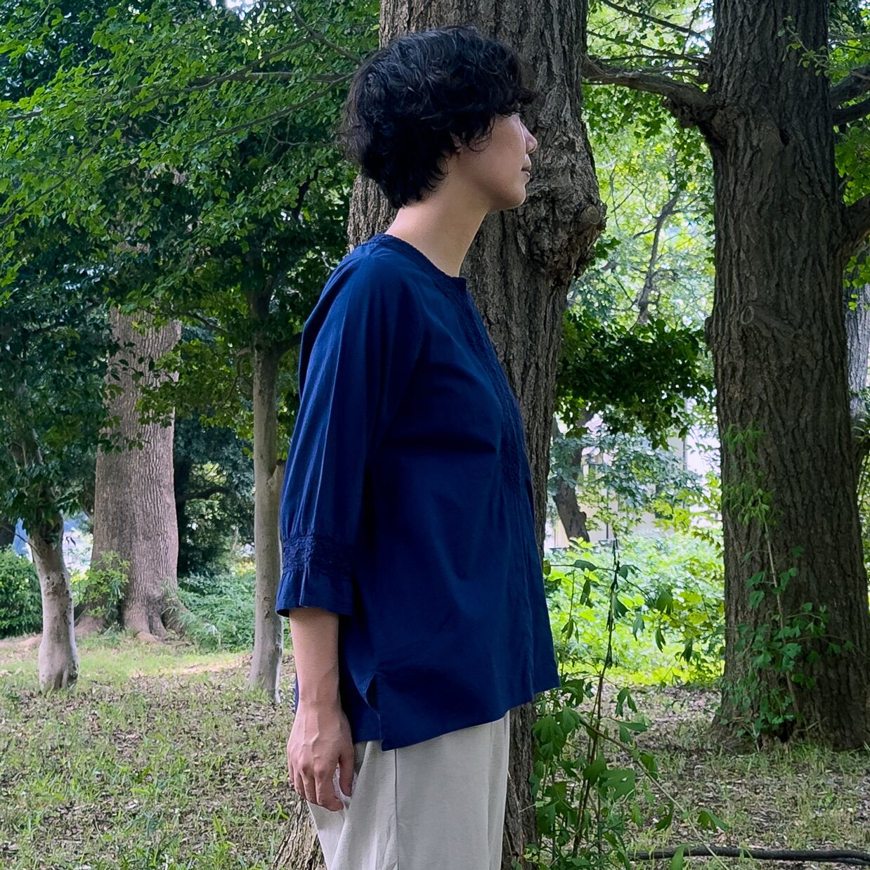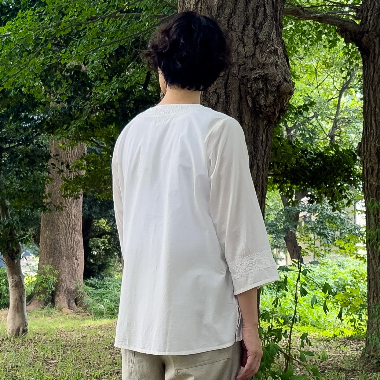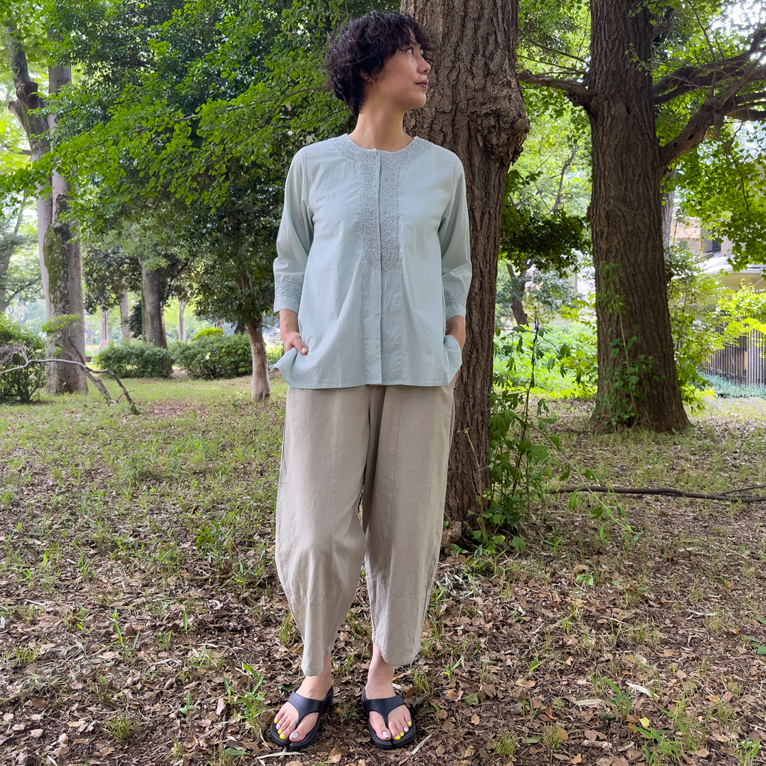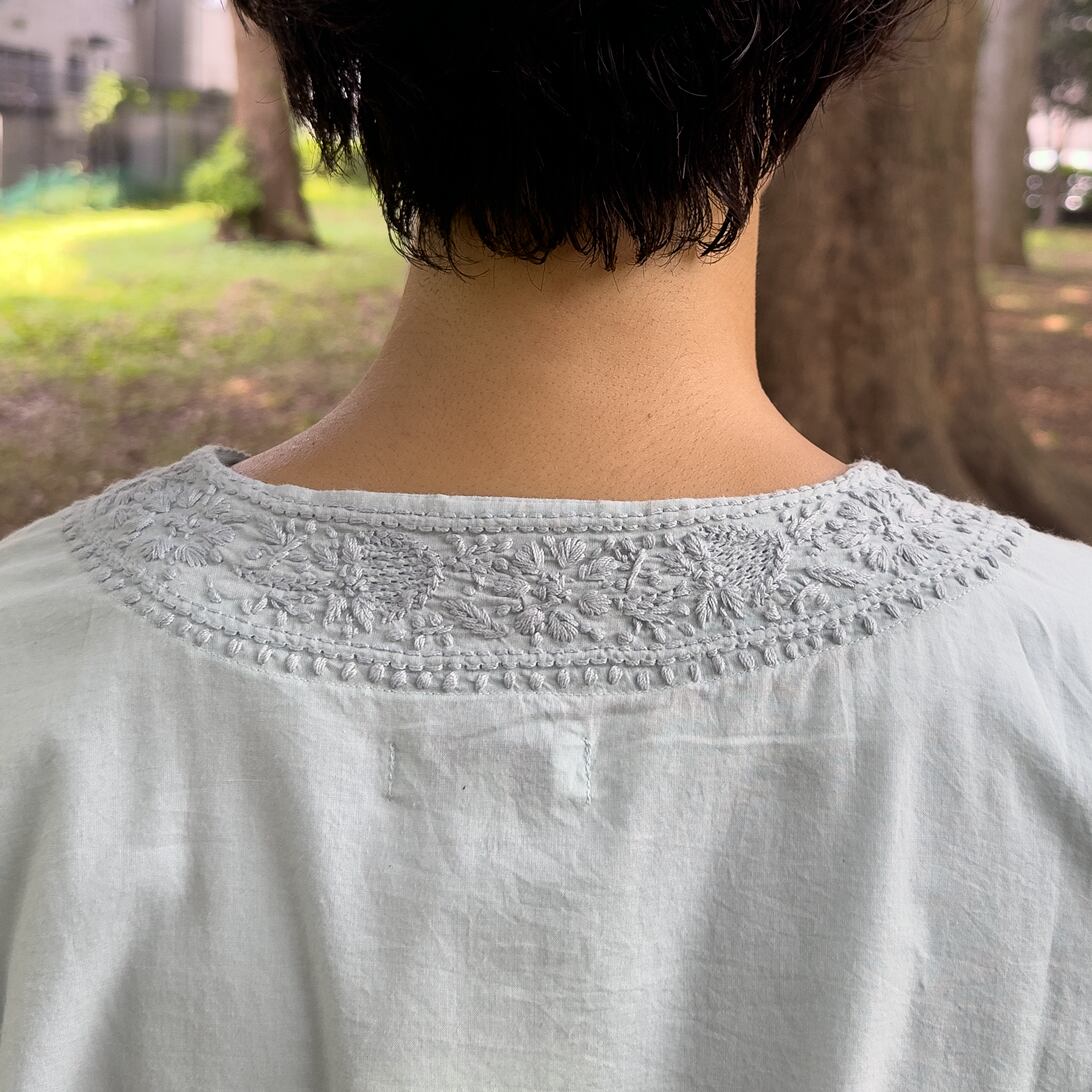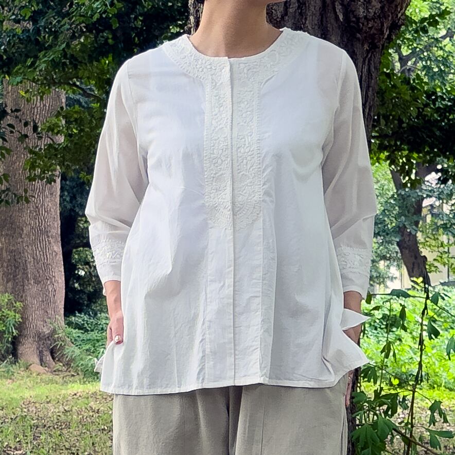 インド綿のブラウスの襟元と袖口に、美しいラクノウ刺繍をあしらいました。